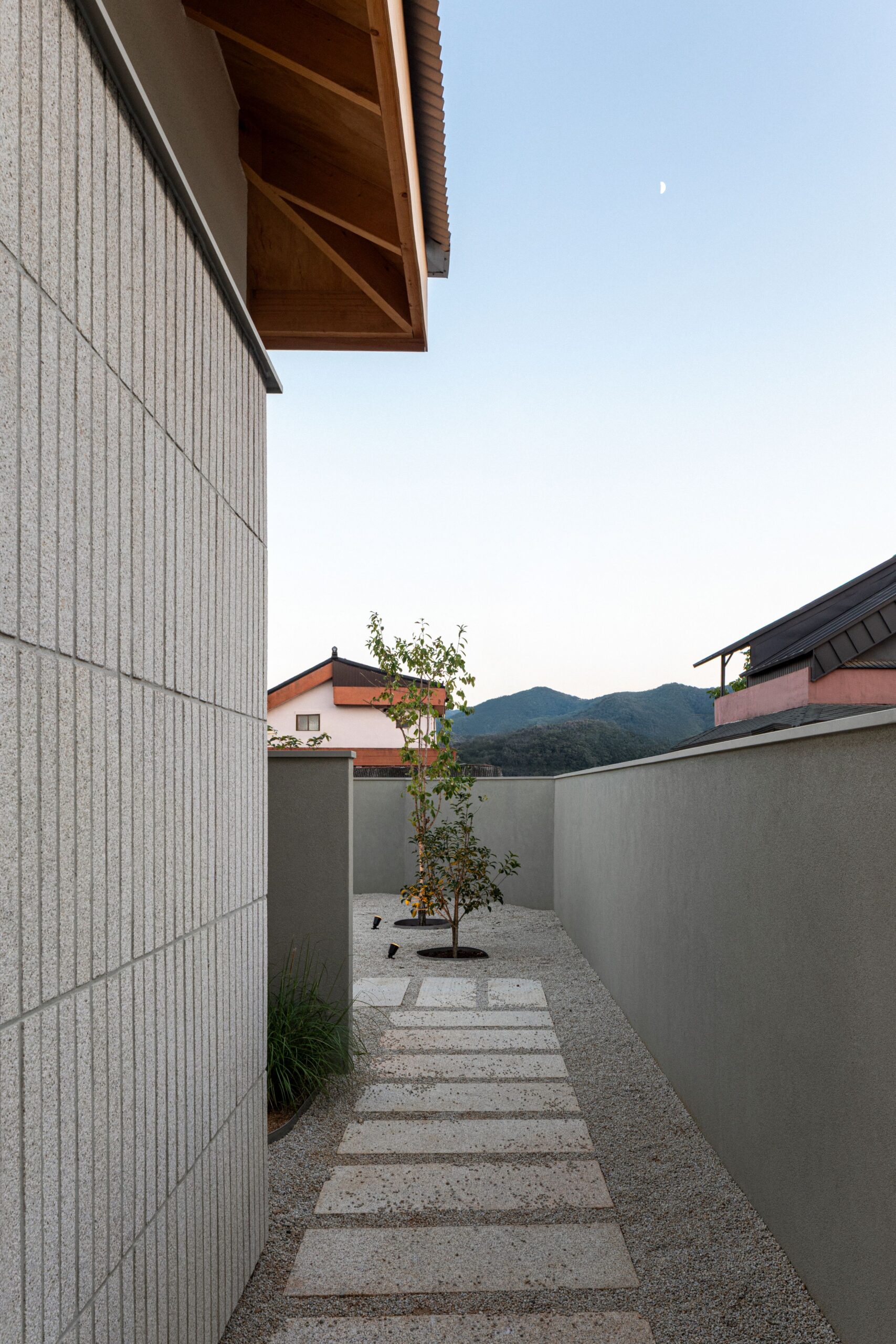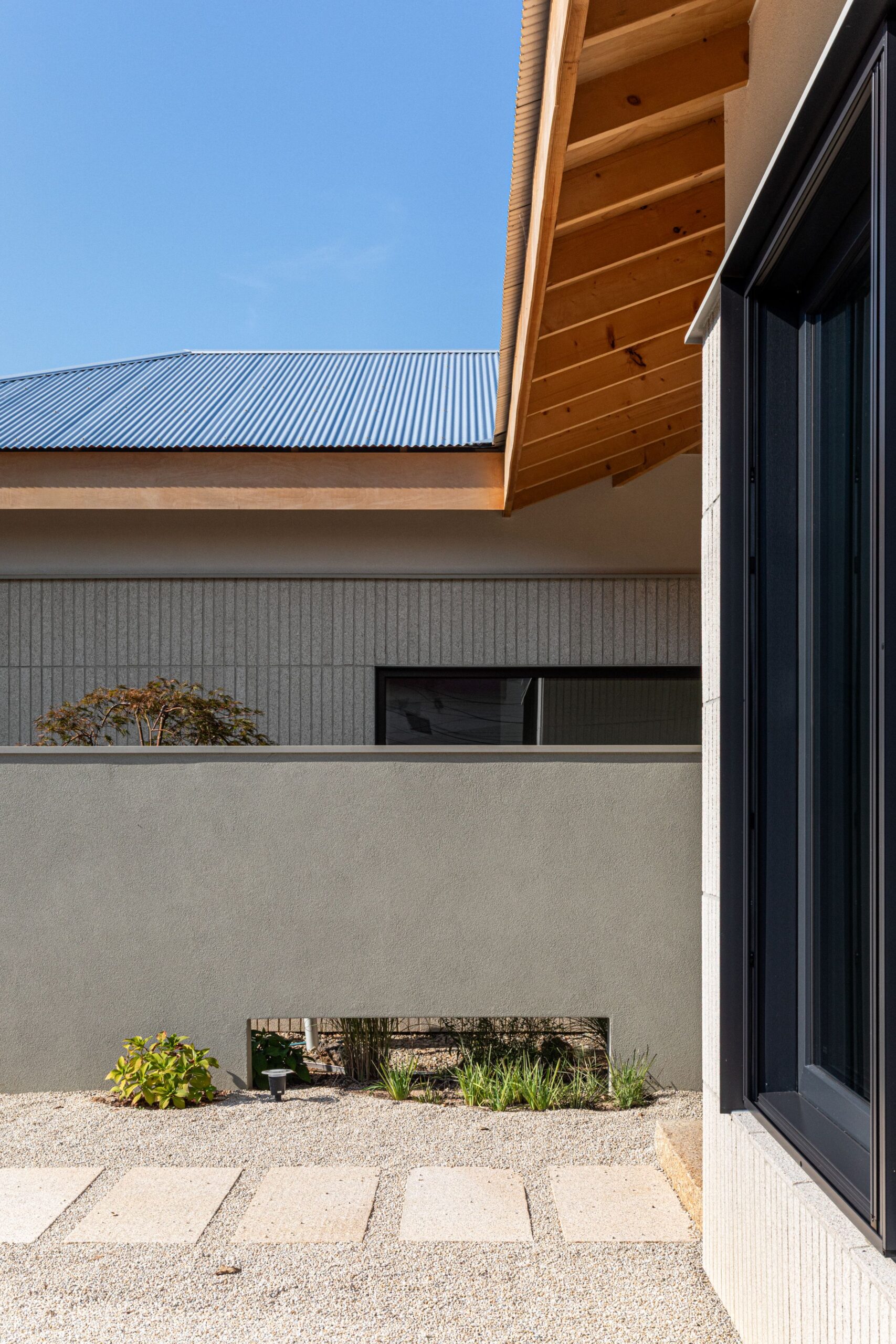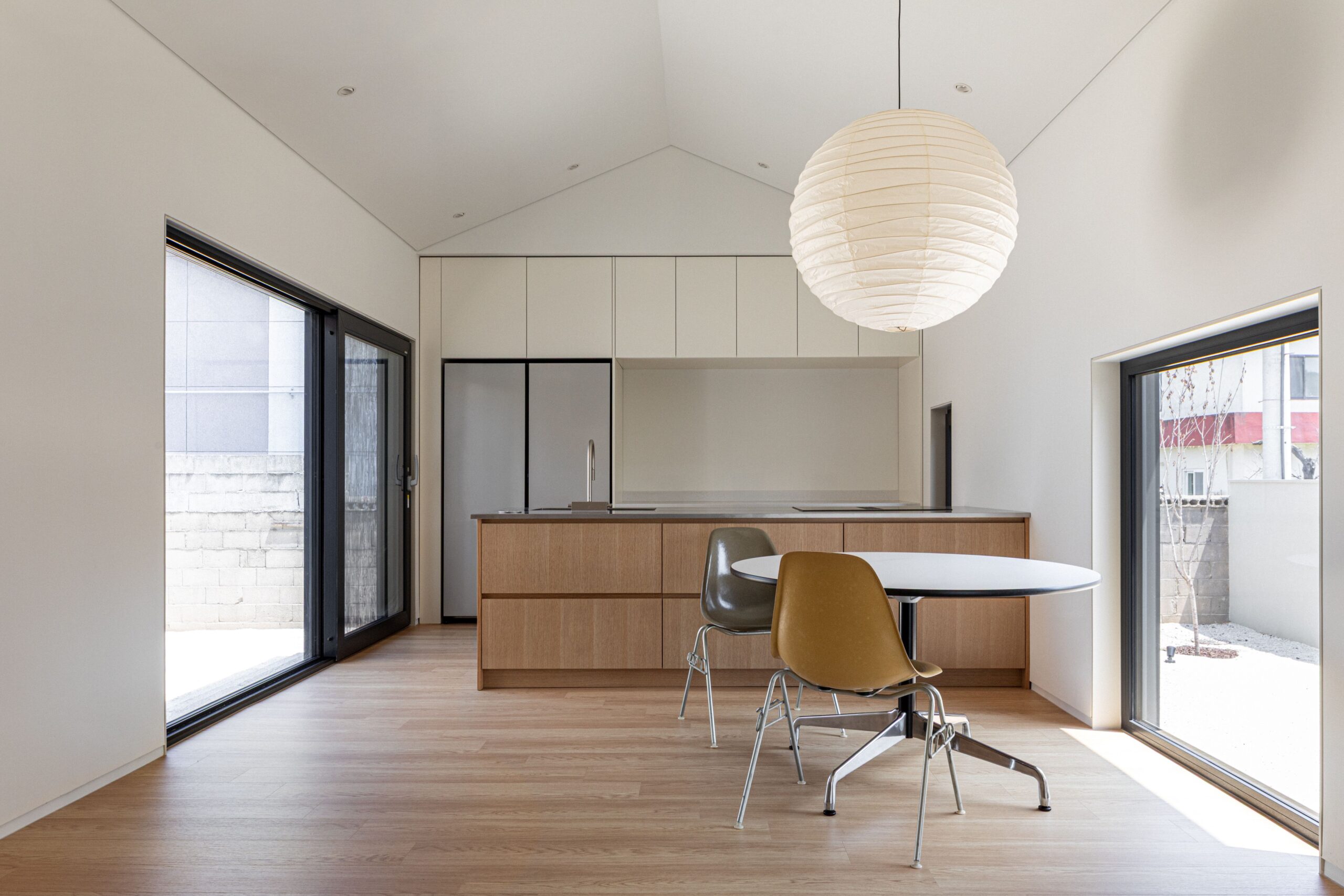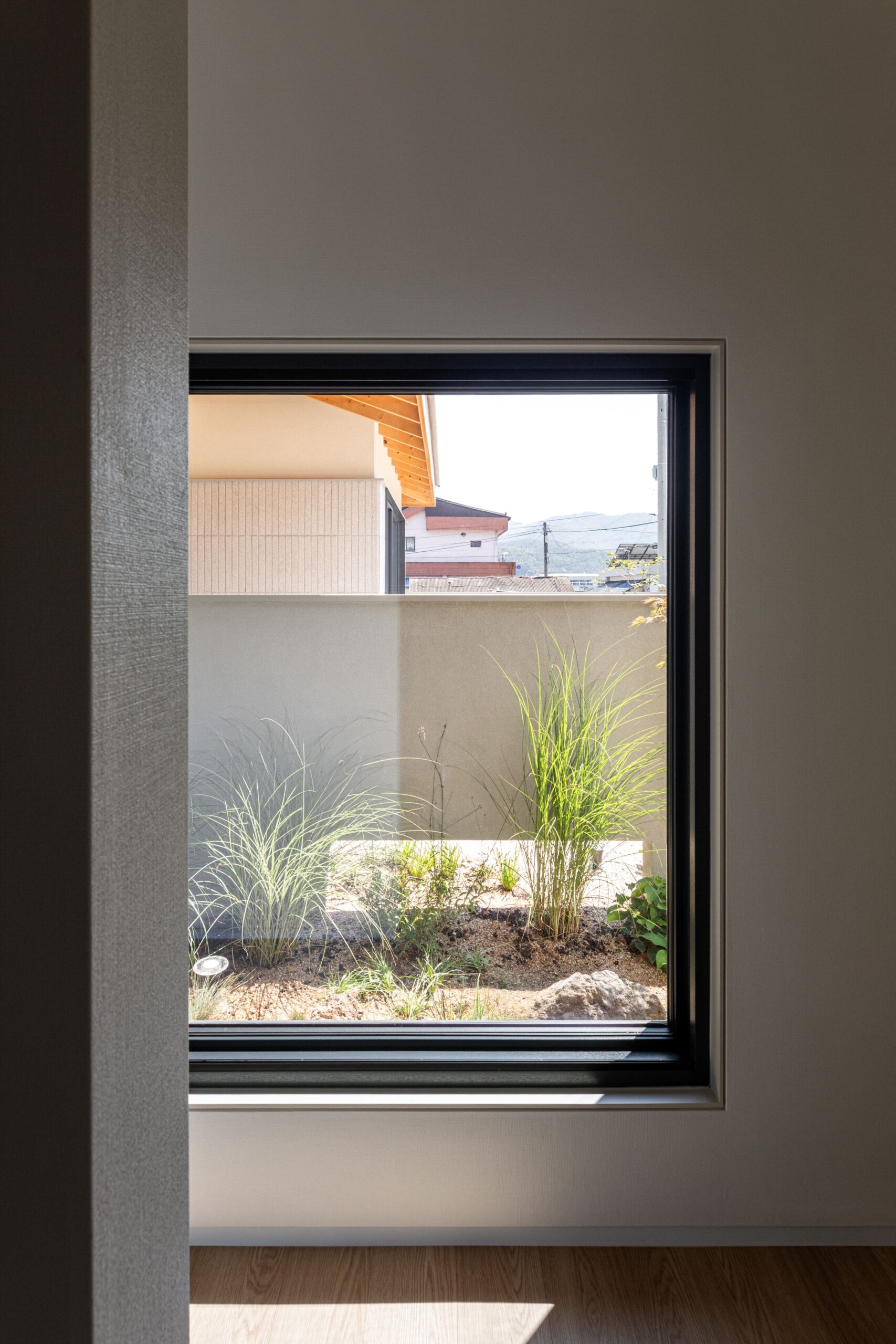 계획하기로 한 면적은 30평, 대지는 120평. 전체의 땅에서 실들을 어떻게 배치하고 외부 공간과 어떻게 관계를 맺을지가 이 프로젝트의 주요점이었다. 우리는 각 실을 외부와 연결된 파장의 중심으로 보고, 이를 흩어 배치하고자 했다. 이렇게 흩어진 중심들은 남북으로 나뉘고, 다시 동서로 갈라지며 대지 위에 골고루 분포되었다. 거실, 다이닝과 주방, 방, 방과 드레스룸 등 네 개의 주요 공간은 외부 마당에 둘러싸이도록 배치되었고, 이 실들은 중심의 복도를 통해 연결된다. 이러한 구성은 마당을 자연스럽게 네 개의 영역으로 분할하며, 채광과 환기를 극대화하고 주차, 진입, 보는마당, 사용하는 마당 등으로 나뉘어 졌다.