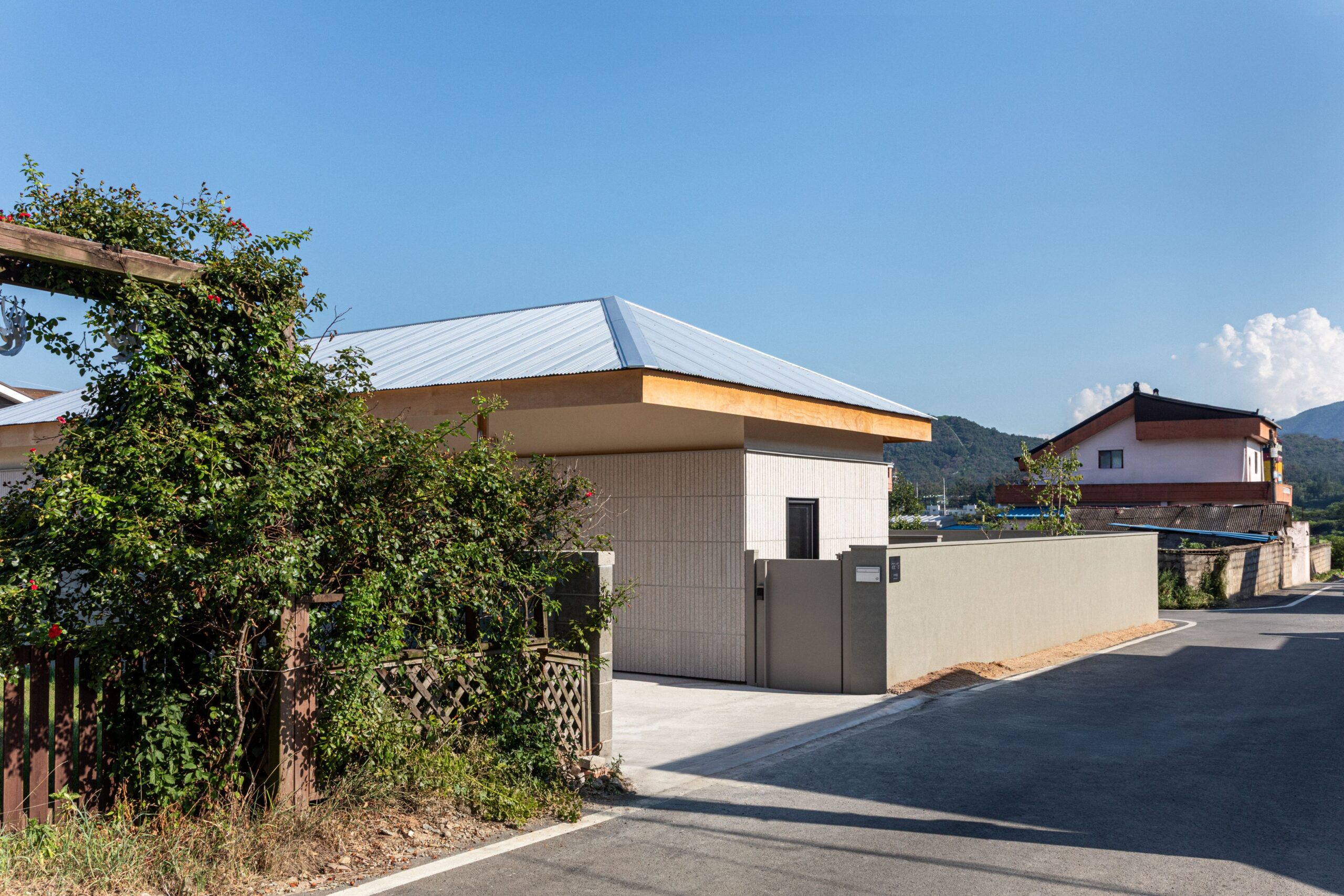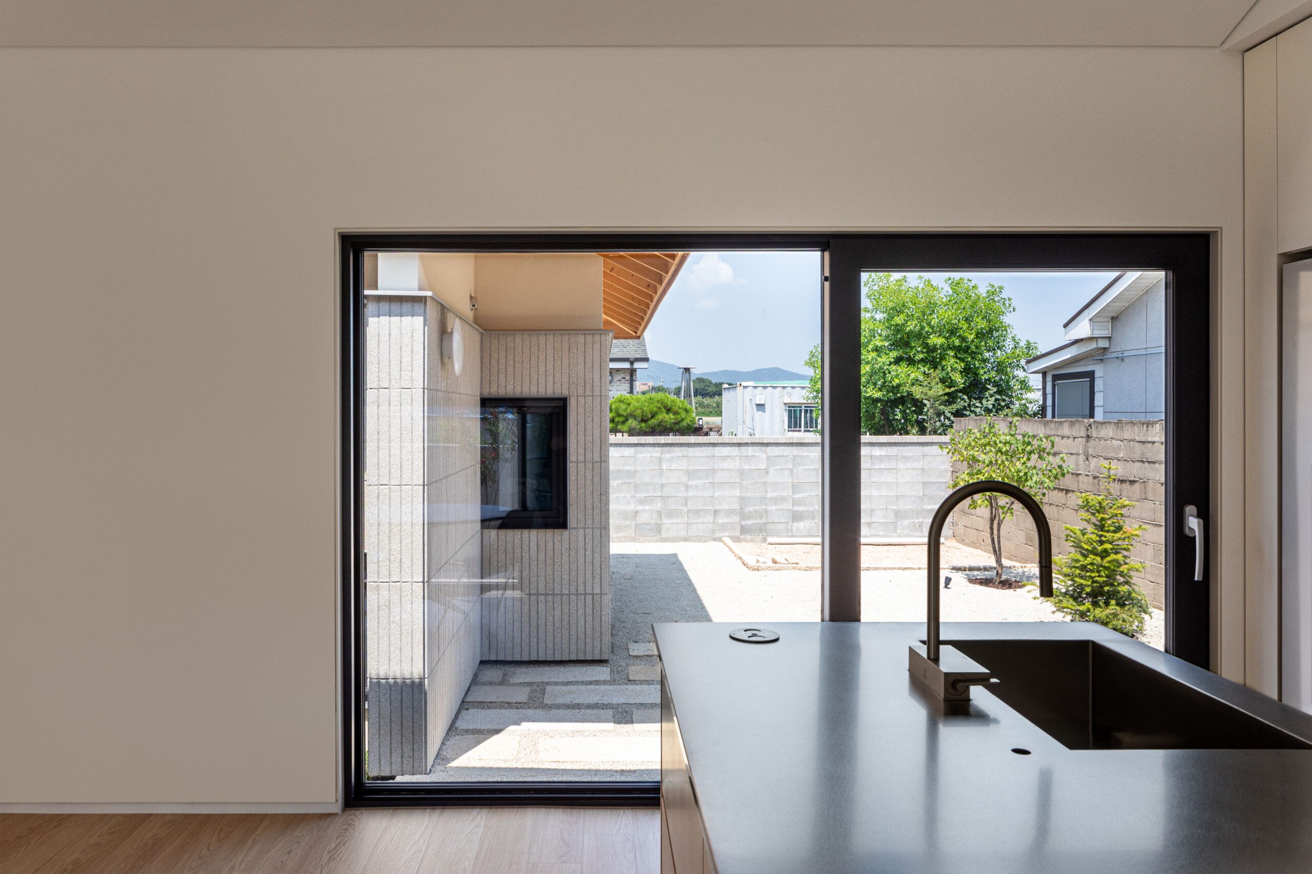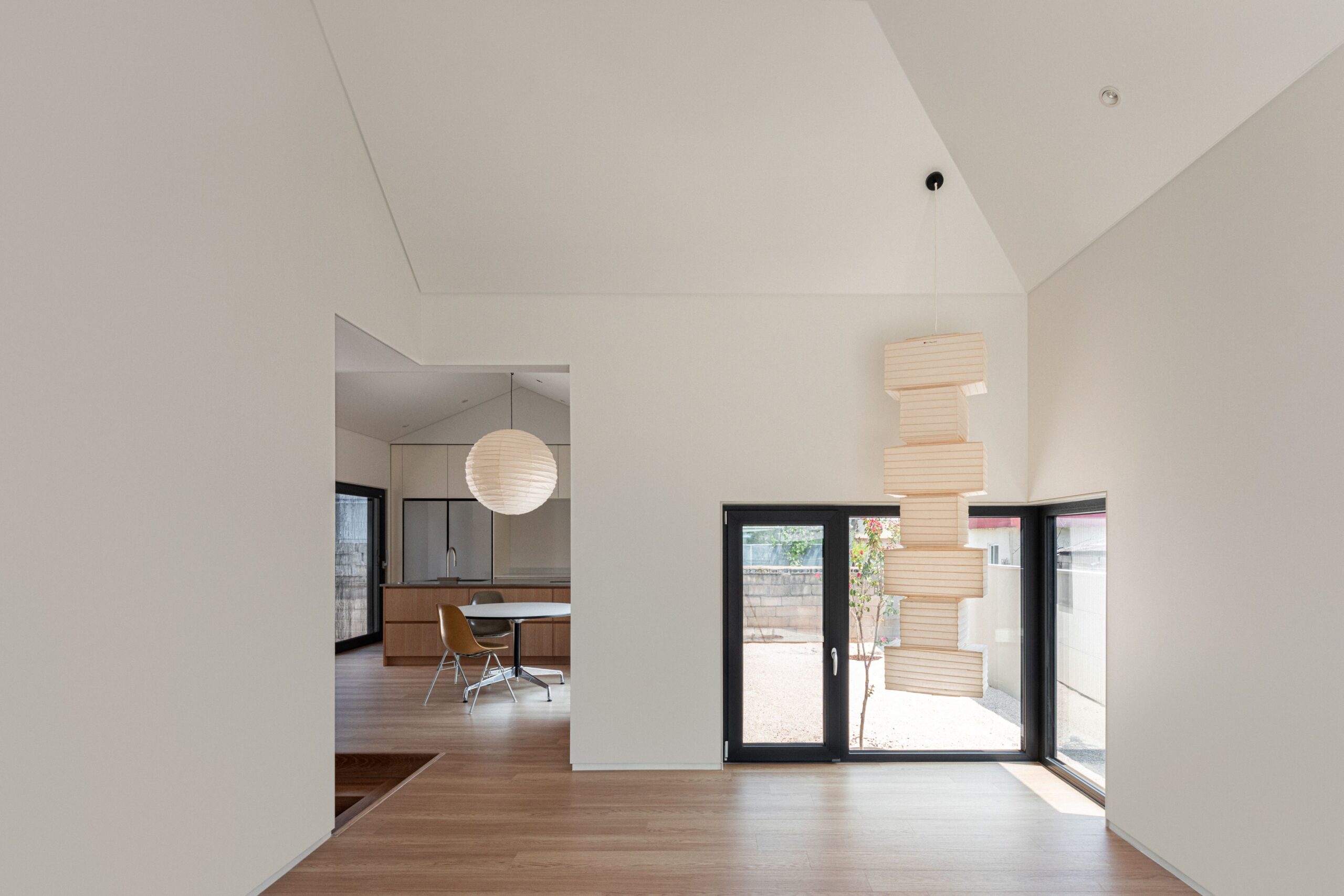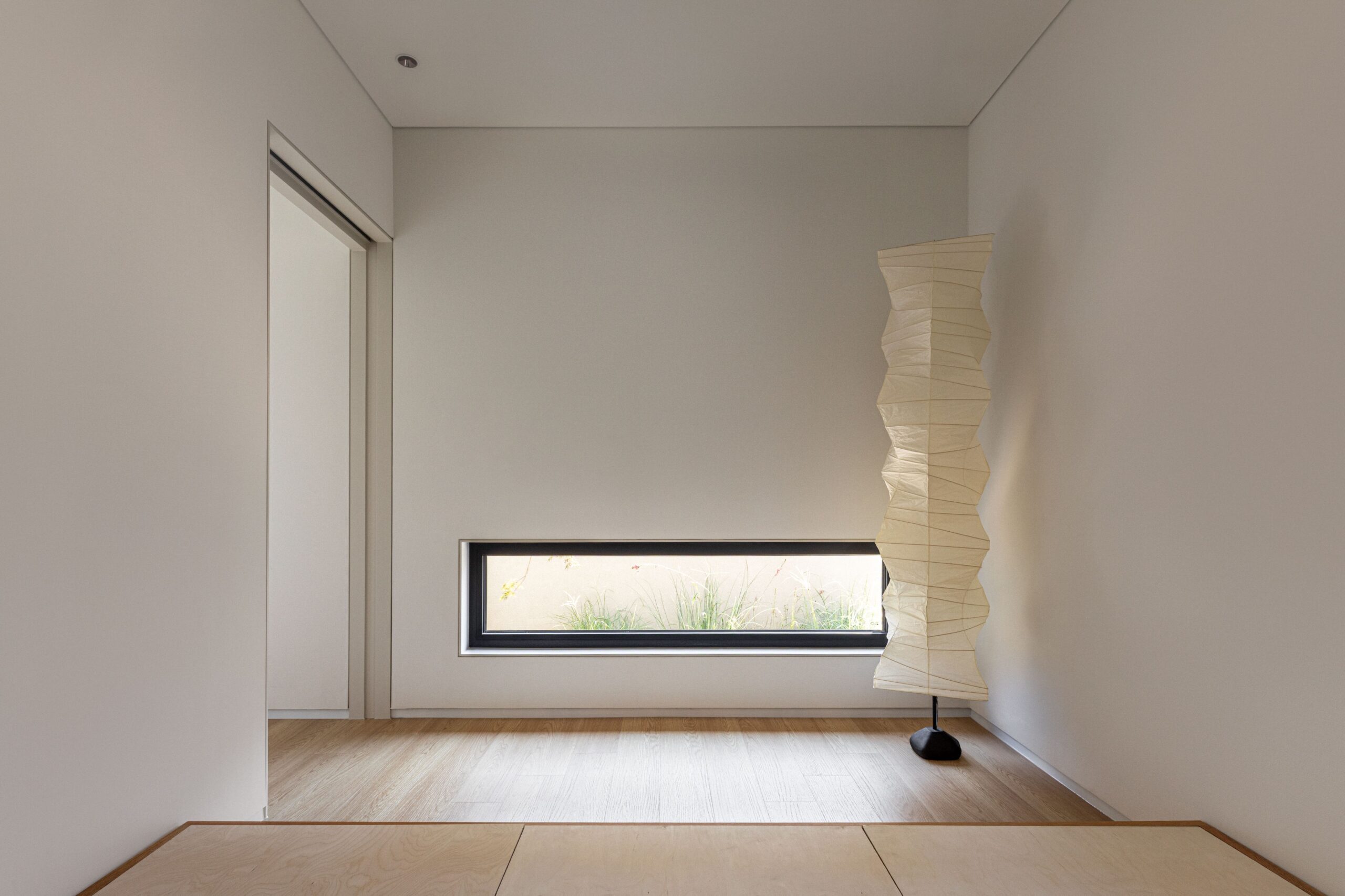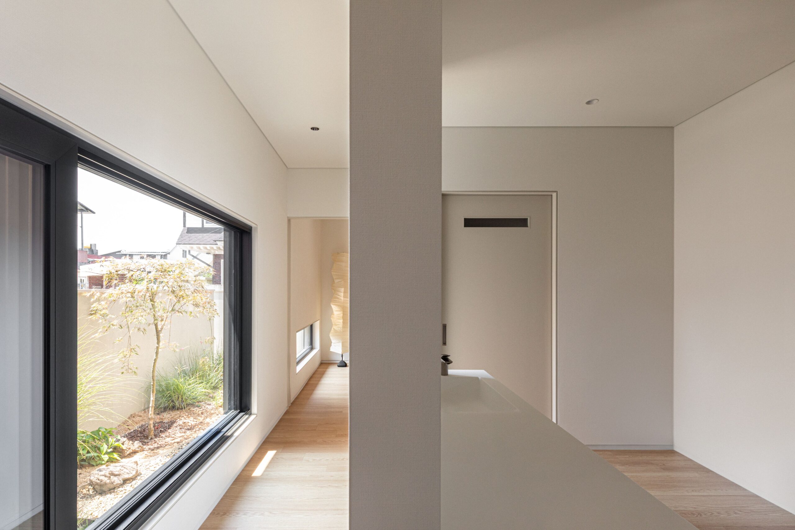 계획하기로 한 면적은 30평, 대지는 120평. 전체의 땅에서 실들을 어떻게 배치하고 외부 공간과 어떻게 관계를 맺을지가 이 프로젝트의 주요점이었다. 우리는 각 실을 외부와 연결된 파장의 중심으로 보고, 이를 흩어 배치하고자 했다. 이렇게 흩어진 중심들은 남북으로 나뉘고, 다시 동서로 갈라지며 대지 위에 골고루 분포되었다. 거실, 다이닝과 주방, 방, 방과 드레스룸 등 네 개의 주요 공간은 외부 마당에 둘러싸이도록 배치되었고, 이 실들은 중심의 복도를 통해 연결된다. 이러한 구성은 마당을 자연스럽게 네 개의 영역으로 분할하며, 채광과 환기를 극대화하고 주차, 진입, 보는마당, 사용하는 마당 등으로 나뉘어 졌다.